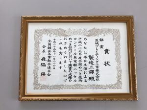 全国鍍金工業組合連合会主催の平成29年度全国めっき技術コンクール無電解ニッケル部門において、当社、製造部製造三課が銀賞を製造部製造一課が銅賞を受賞いたしました。